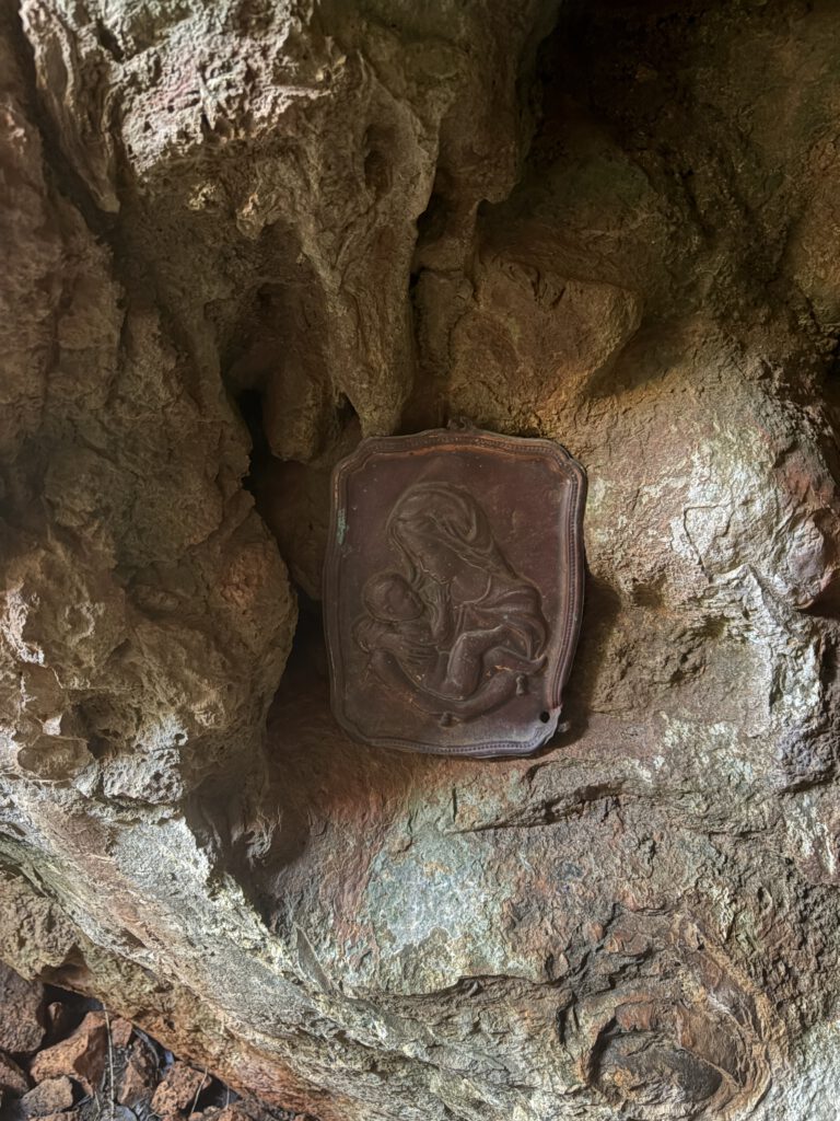De grot heeft een lange geschiedenis en is verbonden met lokale legendes en devotie. Eeuwen geleden zochten mensen hier beschutting en troost. En terwijl ik daar stond ā met gras in mijn haar en Tommy hijgend naast me ā voelde ik heel even dezelfde rust.