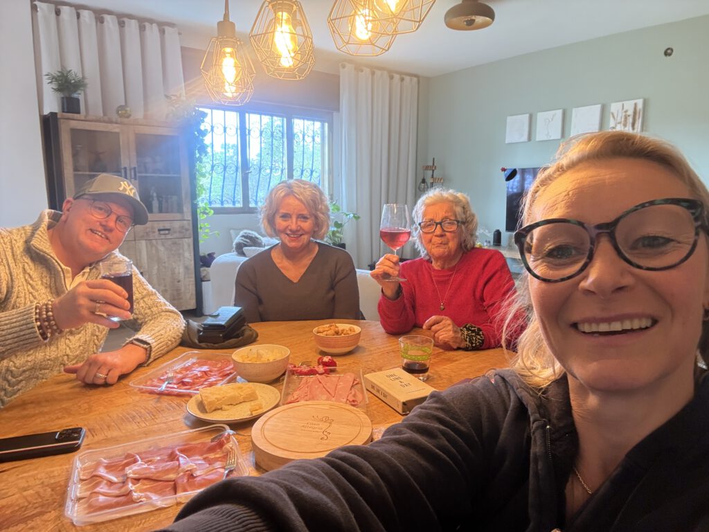 We begonnen met een uitgebreide borrelplank (want ja, daar hoort het bij 😉) en daar kreeg ik meteen een prachtig verjaardagskado: een houten borrelplank met ingebouwde kaasmesjes, met het logo van Casa Allegria erin gebrand. Hoe bijzonder is dat… een eerste tastbaar stukje van wat straks mijn plek gaat worden.